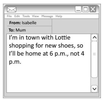 Isabelle is going to be shopping in town untilat least 6 p.m.