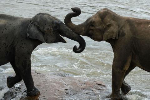 The elephants play together.